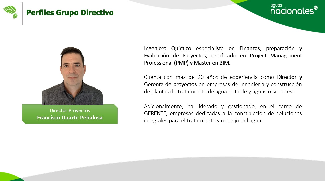 | Director de Proyectos | Francisco Duarte Peñalosa | Ver perfil | francisco.duarte@aguasnacionalesepm.com |