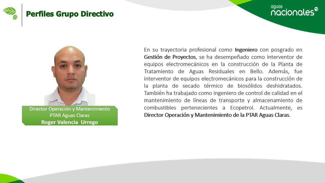 | Director planta de tratamiento | Roger Valencia Urrego | Ver perfil | roger.valencia@aguasnacionalesepm.com |